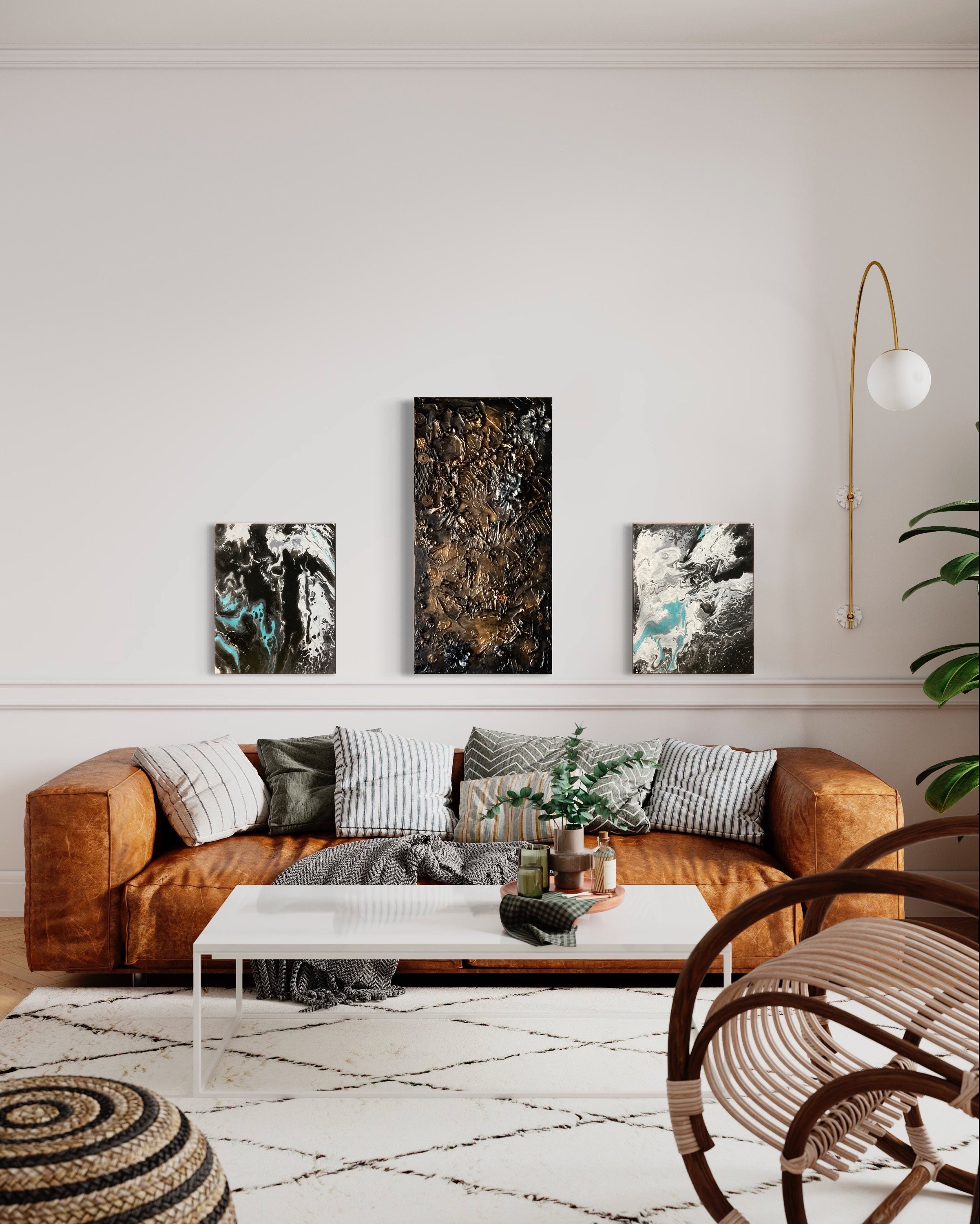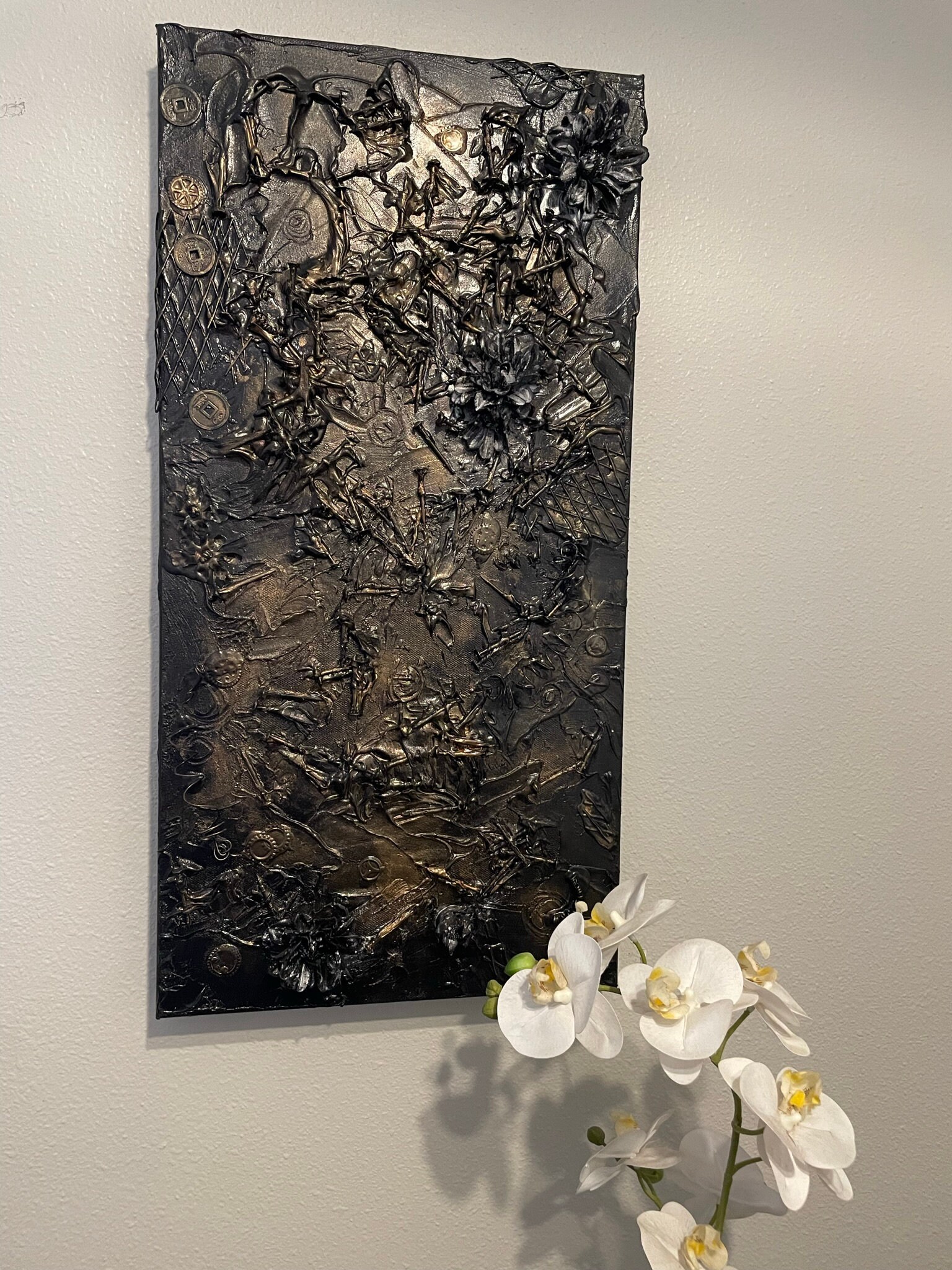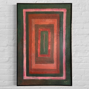 This multi-media piece is intended to draw the viewer close and invite them into alternative moment. This painting can stand out against a loud or quiet wall. It's adornments allow the viewer to interact with it. This canvas, metal, clay, paint and cloth piece is ready to be a centerpiece in your space. Paired with 2 other paintings available in my shop.